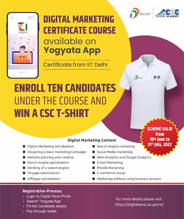 वीएलई, योगयता ऐप पर डिजिटल मार्केटिंग सर्टिफिकेट कोर्स उपलब्ध है। कोर्स सर्टिफिकेट IIT दिल्ली से दिया जाएगा।